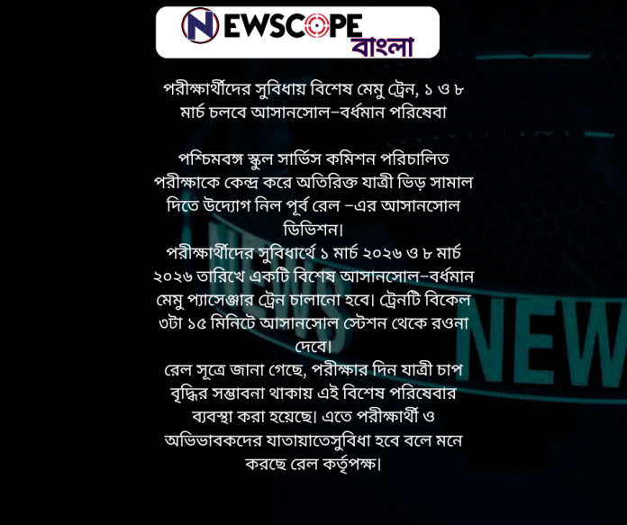 পরীক্ষার্থীদের সুবিধায় বিশেষ মেমু ট্রেন, ১ ও ৮ মার্চ চলবে আসানসোল–বর্ধমান পরিষেবা
