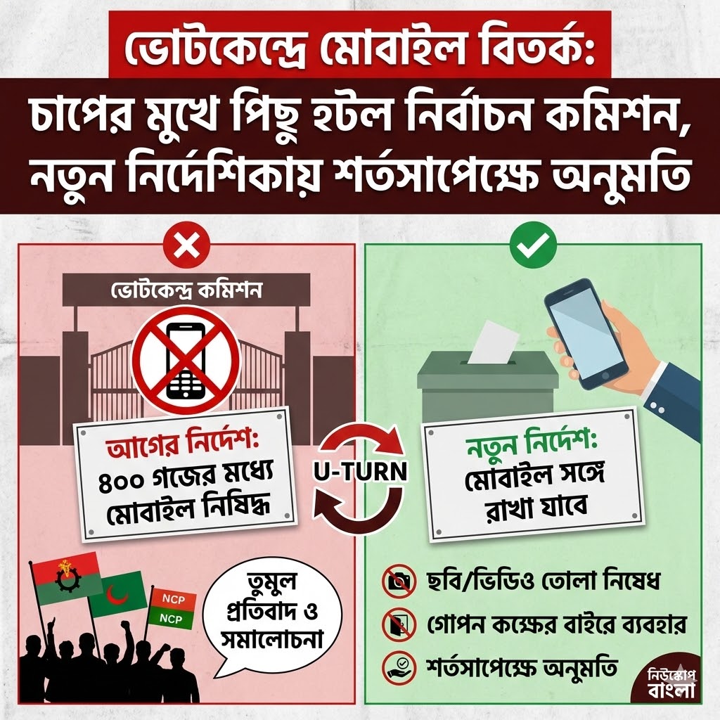 আগের নির্দেশ ও বিতর্ক: রবিবার নির্বাচন কমিশন এক নির্দেশিকায় জানিয়েছিল, ভোটকেন্দ্রের ৩৬৫ মিটার বা ৪০০ গজের মধ্যে ভোটাররা মোবাইল ফোন নিয়ে প্রবেশ করতে পারবেন না। এই নির্দেশের পরই সরব হয় বিএনপি (BNP), জামায়াতে ইসলামী (Jamaat-e-Islami) এবং এনসিপি (NCP)-র মতো দলগুলো। বিএনপি নেতা রুহুল কবির রিজভী (Ruhul Kabir Rizvi) এটিকে অযৌক্তিক বলে দাবি করেন। অন্যদিকে, এনসিপি নেতা নাহিদ ইসলাম (Nahid Islam) হুঁশিয়ারি দেন, নির্দেশ না বদলালে কমিশন ঘেরাও করা হবে। জামায়াত নেতারা আশঙ্কা প্রকাশ করেন যে, এর ফলে ভোটারদের মনে ভয় কাজ করবে।