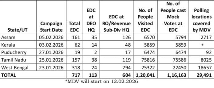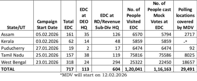 জেলা নির্বাচন আধিকারিক ও রিটার্নিং অফিসারদের দফতরে ইভিএম প্রদর্শনী কেন্দ্র চালু করা হয়েছে এবং মোবাইল ডেমোনস্ট্রেশন ভ্যানের মাধ্যমে বিভিন্ন এলাকায় প্রচার চালানো হচ্ছে। ১০ ফেব্রুয়ারি ২০২৬ পর্যন্ত পাঁচ রাজ্য ও কেন্দ্রশাসিত অঞ্চলে ১.২০ লক্ষেরও বেশি ভোটার এই প্রদর্শনী শিবিরে অংশ নিয়েছেন এবং বহু ভোটকেন্দ্র এলাকায় সরাসরি প্রদর্শনের ব্যবস্থা করা হয়েছে।