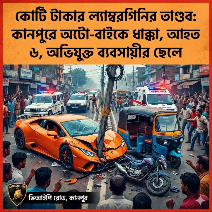 রাস্তায় দাপিয়ে বেড়াচ্ছে কোটি টাকার গাড়ি, আর তার ধাক্কায় প্রাণ ওষ্ঠাগত সাধারণ মানুষের। ফের খবরের শিরোনামে উত্তর প্রদেশ (Uttar Pradesh)। এবার ঘটনাস্থল কানপুর (Kanpur)-এর ভিআইপি রোড (VIP Road)। রবিবার বিকেলে গতির নেশায় মত্ত এক ল্যাম্বরগিনি (Lamborghini) চালক নিয়ন্ত্রণ হারিয়ে পরপর ধাক্কা মারলেন অটো এবং বাইককে। এই ঘটনায় অন্তত ৬ জন গুরুতর আহত (Injured) হয়েছেন। অভিযুক্ত চালক আর কেউ নন, স্থানীয় এক প্রভাবশালী ব্যবসায়ীর ছেলে।