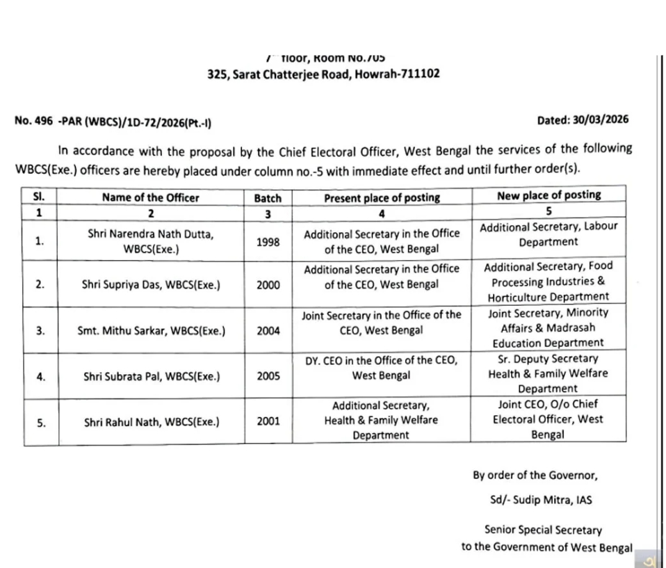 জারি করা বিজ্ঞপ্তি অনুযায়ী, সিইও দপ্তরে থাকা নরেন্দ্রনাথ দত্তকে শ্রম দফতরের অতিরিক্ত সচিব করে পাঠানো হয়েছে। তিনি ১৯৯৮ সালের ডব্লিউবিসিএস অফিসার। সুপ্রিয় দাসকে বদলি করে পাঠানো হয়েছে খাদ্য-প্রক্রিয়াকরণ এবং উদ্যানপালন বিভাগে।