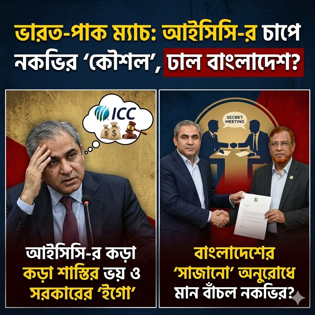 বাংলাদেশের ‘সাজানো’ অনুরোধ: নকভির পরিকল্পনা মতোই লাহোরে (Lahore) উড়ে যান বিসিবি প্রধান। এরপর তিনি সংবাদমাধ্যমে বিবৃতি দিয়ে বলেন, “বিশ্ব ক্রিকেটের ইকোসিস্টেম বা স্বার্থের কথা মাথায় রেখে আমি পাকিস্তানকে অনুরোধ করছি ভারতের বিরুদ্ধে ম্যাচটি খেলার জন্য।” সূত্রের খবর, এই অনুরোধটি আসলে ছিল নকভিরই শিখিয়ে দেওয়া বুলি। যাতে পাকিস্তান সরকার বলতে পারে—”আমরা বয়কটে অনড় ছিলাম, কিন্তু বন্ধু দেশ বাংলাদেশ (Bangladesh) এবং শ্রীলঙ্কা (Sri Lanka)-র অনুরোধে এবং ক্রিকেটের স্বার্থে আমরা নমনীয় হয়েছি।”