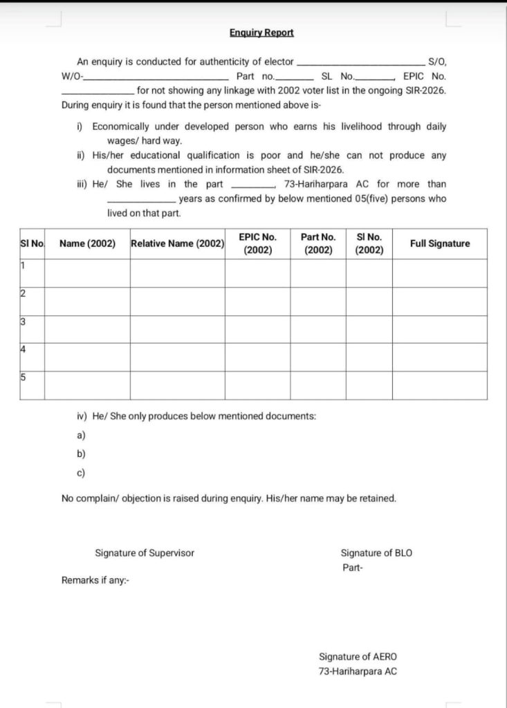 স্পেশাল রোল অবজার্ভার সুব্রত গুপ্ত সংশ্লিষ্টয়এই নথির উল্লেখ করে এই প্রতিবেদককে বলেন, আমরা এরকম কোনও আবেদনপত্র বিলি করিনি। ১৯ জানুয়ারি এবং ৯ ফেব্রুয়ারি সুপ্রিম কোর্ট এসআইআর-এ মান্যতার জন্য যেসব নথির কথা উল্লেখ করেছে, সেগুলো মেনে চলা হচ্ছে। এধরণের ভুয়া নথি ছড়িয়ে বিভ্রান্তি তৈরির চেষ্টা হচ্ছে।