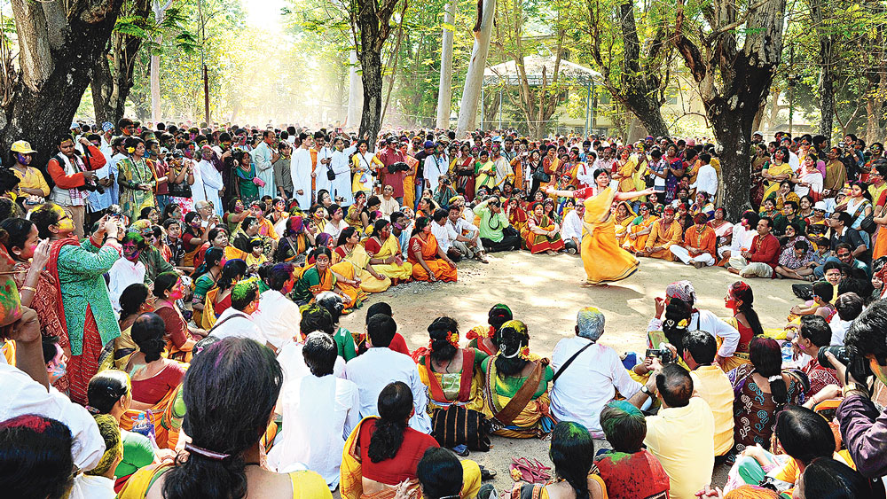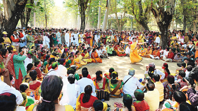 শান্তিনিকেতনের রাঙা মাটি আর পলাশের লাল রঙ যখন মিলেমিশে একাকার হয়ে যায়, তখন মনে হয় বসন্ত বুঝি এখানেই তার ঘর বেঁধেছে। কৃত্রিম রঙের বদলে ভেষজ আবিরের ব্যবহার উৎসবের নান্দনিকতাকে আরও বাড়িয়ে তুলেছে। দিনভর গান, নাচ আর আবির খেলার পর শান্ত গোধূলিতে যখন ক্লান্ত রোদ শান্তিনিকেতনের মাঠে এসে পড়ে, তখন চারদিকে এক মায়াবী নিস্তব্ধতা বিরাজ করে।