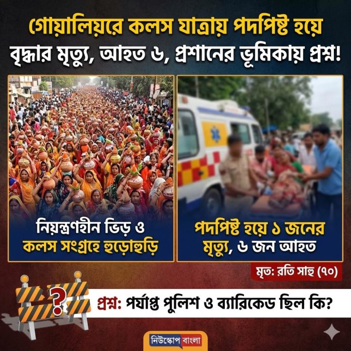 ভক্তির জোয়ারে ভেসে গিয়েছিল মধ্যপ্রদেশের (Madhya Pradesh) গোয়ালিয়র (Gwalior) জেলার ডাবরা শহর। নবগ্রহ মন্দিরের (Navgrah Temple) প্রাণপ্রতিষ্ঠা উৎসব উপলক্ষ্যে আয়োজিত হয়েছিল বিশাল ‘কলস যাত্রা’ (Kalash Yatra)। কিন্তু সেই আনন্দের মুহূর্ত নিমেষেই বদলে গেল বিষাদে। মঙ্গলবারের এই ধর্মীয় শোভাযাত্রায় অত্যধিক ভিড়ের চাপে পদপিষ্ট (Stampede) হয়ে প্রাণ হারালেন এক বৃদ্ধা। আহত হয়েছেন অন্তত ৬ জন, যাদের মধ্যে কয়েকজনের অবস্থা আশঙ্কাজনক।