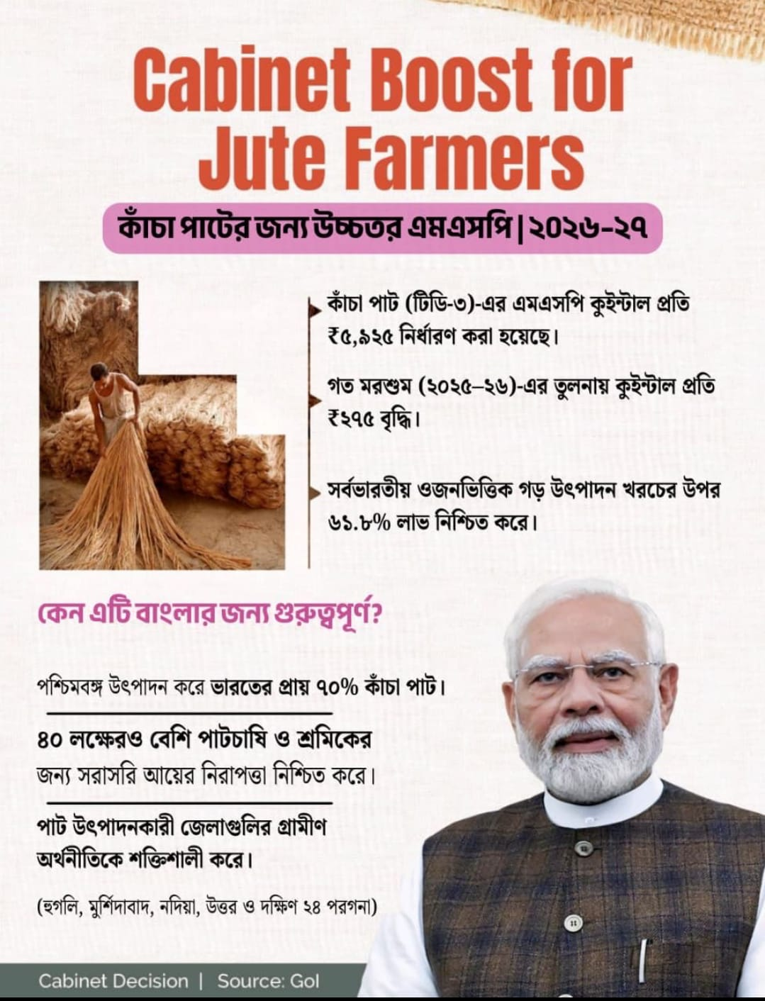 *পশ্চিমবঙ্গের পাট উৎপাদনকারী জেলাগুলি— যেমন হুগলি, মুর্শিদাবাদ, নদিয়া, উত্তর ২৪ পরগনা ও দক্ষিণ ২৪ পরগনা— এর গ্রামীণ অর্থনীতিকে এই ঐতিহাসিক সিদ্ধান্ত আরও শক্তিশালী করবে।”